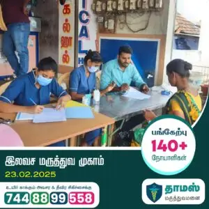 Medical Camp Completed Camp Sunday26.01.2025 Medical Camp Free Medical camp Sunday Phradhamaram, Tenkasi District. More Details Sunday23.02.2025 Medical Camp Free Medical camp Sunday 7/63-3 Madurai main road, Near by Muppudathiyamman kovil Idaikal, Tenkasi, Tamil Nadu 627804 More Details Upcoming Camp Medical Camp Upcoming Upcoming Upcoming More Details
